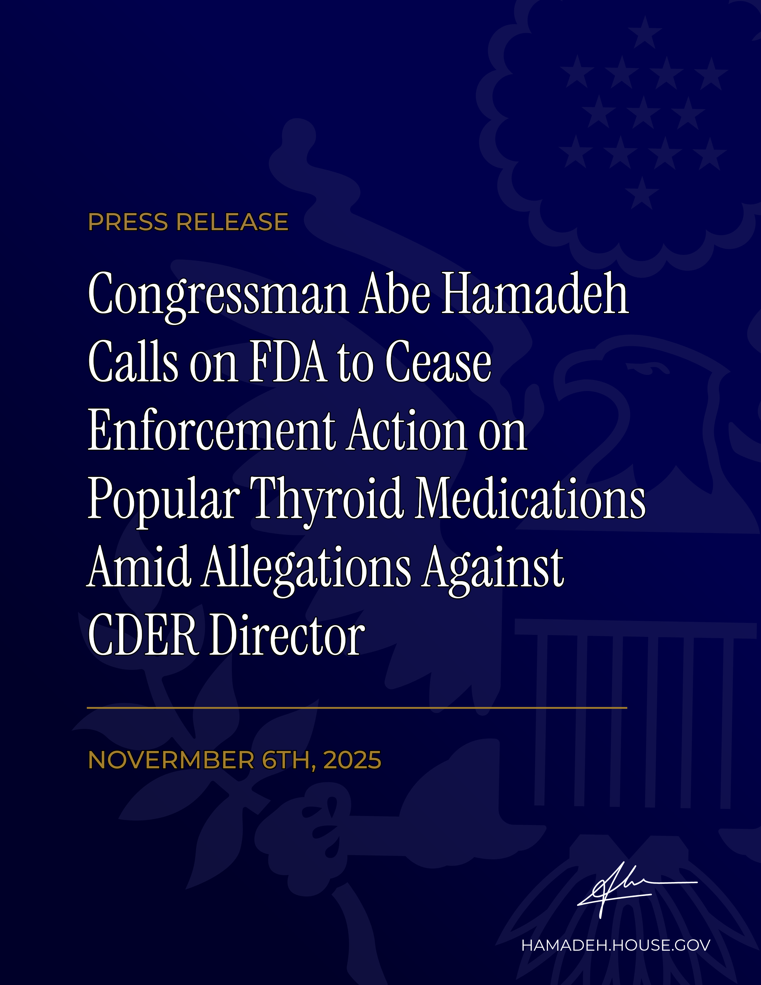Congressman Abe Hamadeh Calls on FDA to Cease Enforcement Action on Popular Thyroid Medications Amid Allegations Against CDER Director
