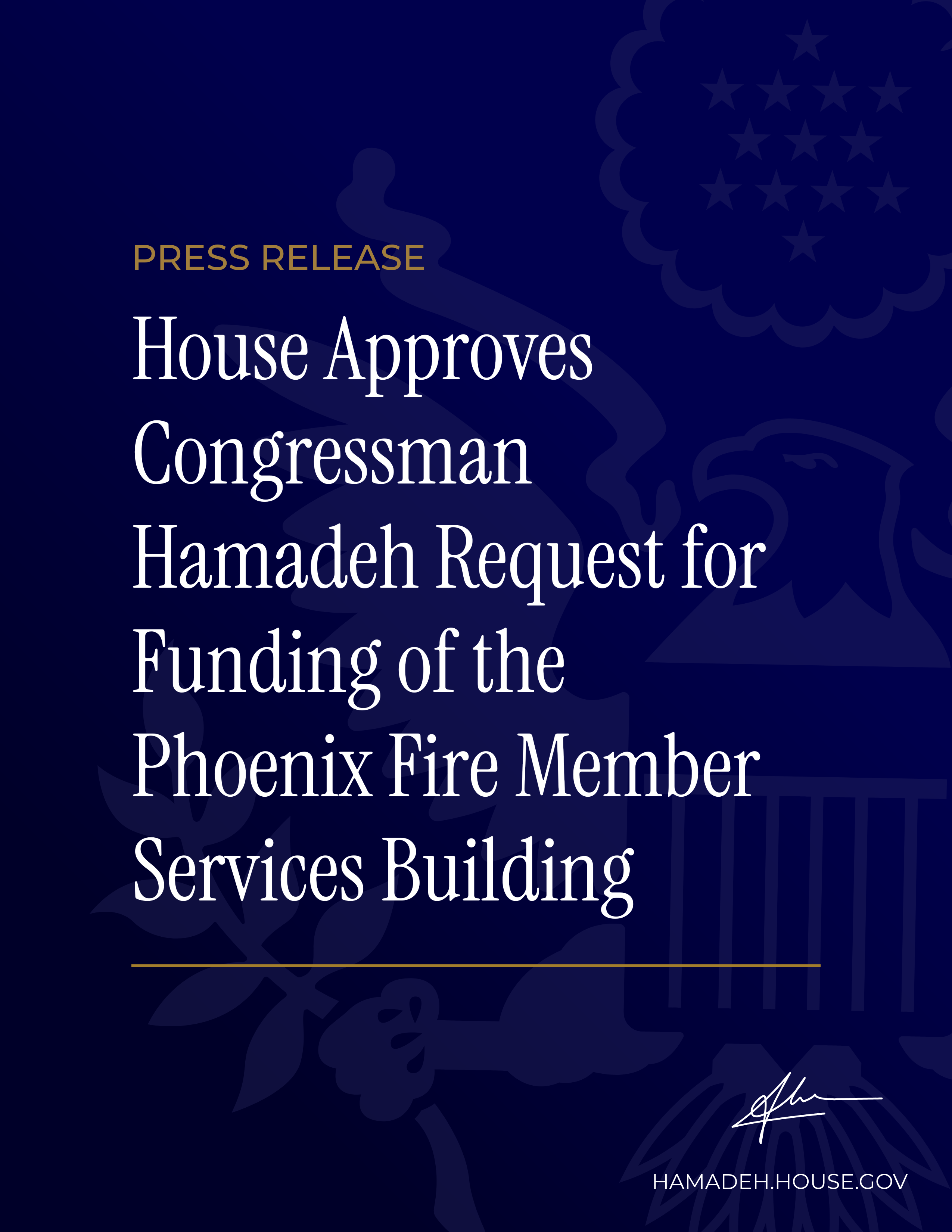 Congressman Hamadeh's request for the Phoenix Fire Member Services Building Renovation in the amount of $1,500,000 was included in H.R. 7148 - Consolidated Appropriations Act of 2026, which the House passed on Thursday by a vote of 341-88.