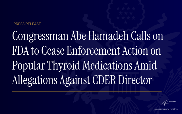 Congressman Abe Hamadeh Calls on FDA to Cease Enforcement Action on Popular Thyroid Medications Amid Allegations Against CDER Director