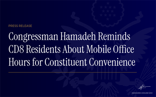 Congressman Hamadeh Reminds CD8 Residents About Mobile Office Hours for Constituent ConvenienceCongressman Abraham Hamadeh (AZ-08) is reminding residents of Arizona’s 8th Congressional District that his staff is hosting mobile office hours by appointment to help constituents with issues they might have working with a federal agency, such as the Department of Veterans Affairs, Social Security Administration, IRS, U.S. Department of State, or U.S. Citizenship and Immigration Services. The mobile office hours and locations are: First Thursday of every month Sunrise Mountain Library 21109 North 98th Avenue Peoria, AZ 85382 Third Thursday of every month Main Library 8463 West Monroe Street Peoria, AZ 85345 To make an appointment please visit Hamadeh.house.gov. Please bring the following with you: